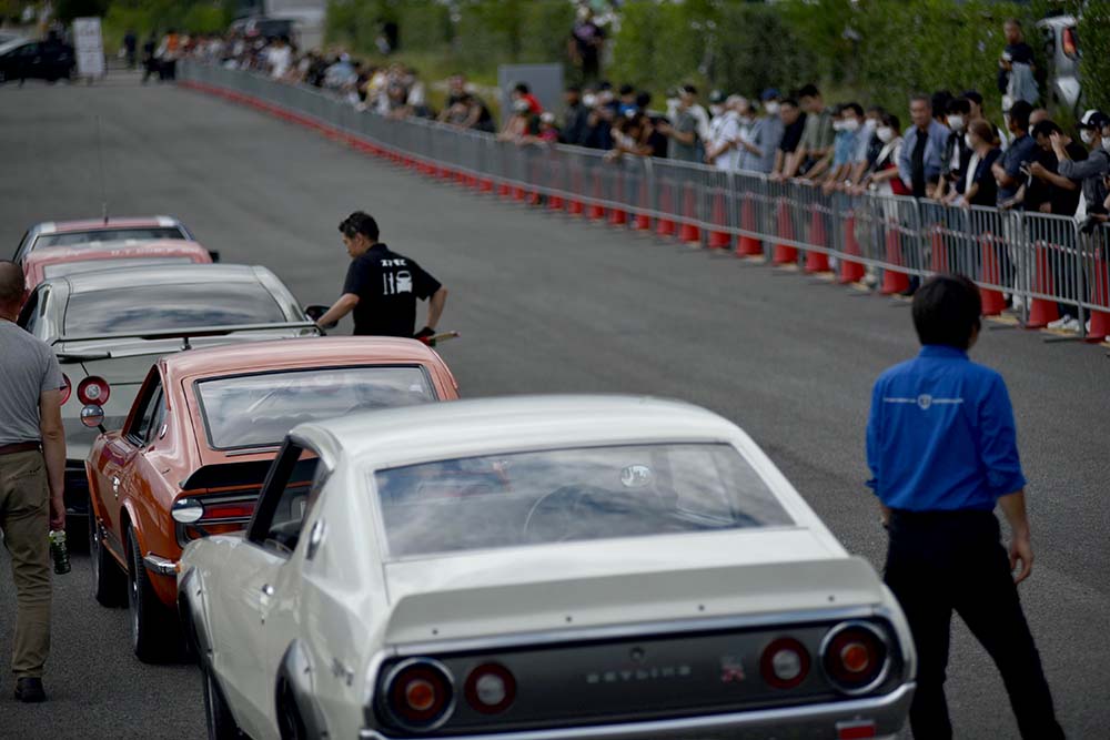 スカイラインGT-Rシリーズの中でも“幻”と言われる通称ケンメリGT-Rや、Z同好会の皆さんが自走で持ち込まれた歴代のフェアレディZが並ぶ姿は壮観で、さらにその名車たちのエンジンがかかると人垣ができていました。